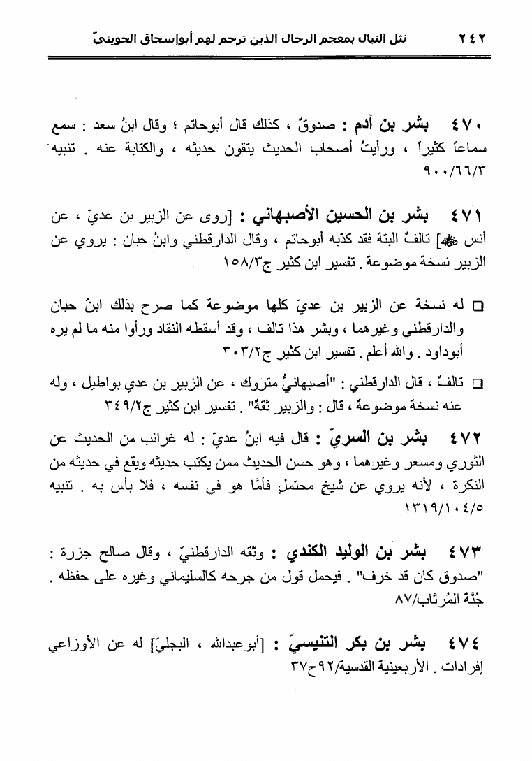 نام کتاب : نثل النبال بمعجم الرجال الذين ترجم لهم فضيلة الشيخ المحدث أبو إسحاق الحويني (ط. المحدثين) نویسنده : أحمد بن عطية الوكيل أبو عمرو جلد : 1 صفحه : 242