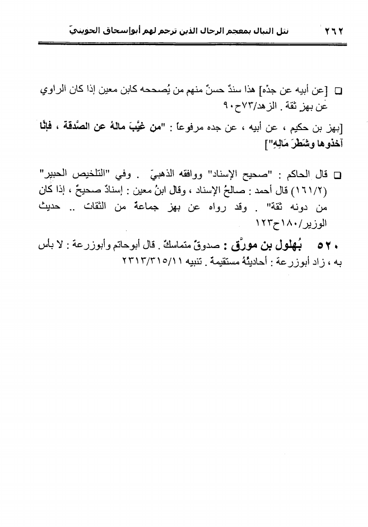 نام کتاب : نثل النبال بمعجم الرجال الذين ترجم لهم فضيلة الشيخ المحدث أبو إسحاق الحويني (ط. المحدثين) نویسنده : أحمد بن عطية الوكيل أبو عمرو جلد : 1 صفحه : 262