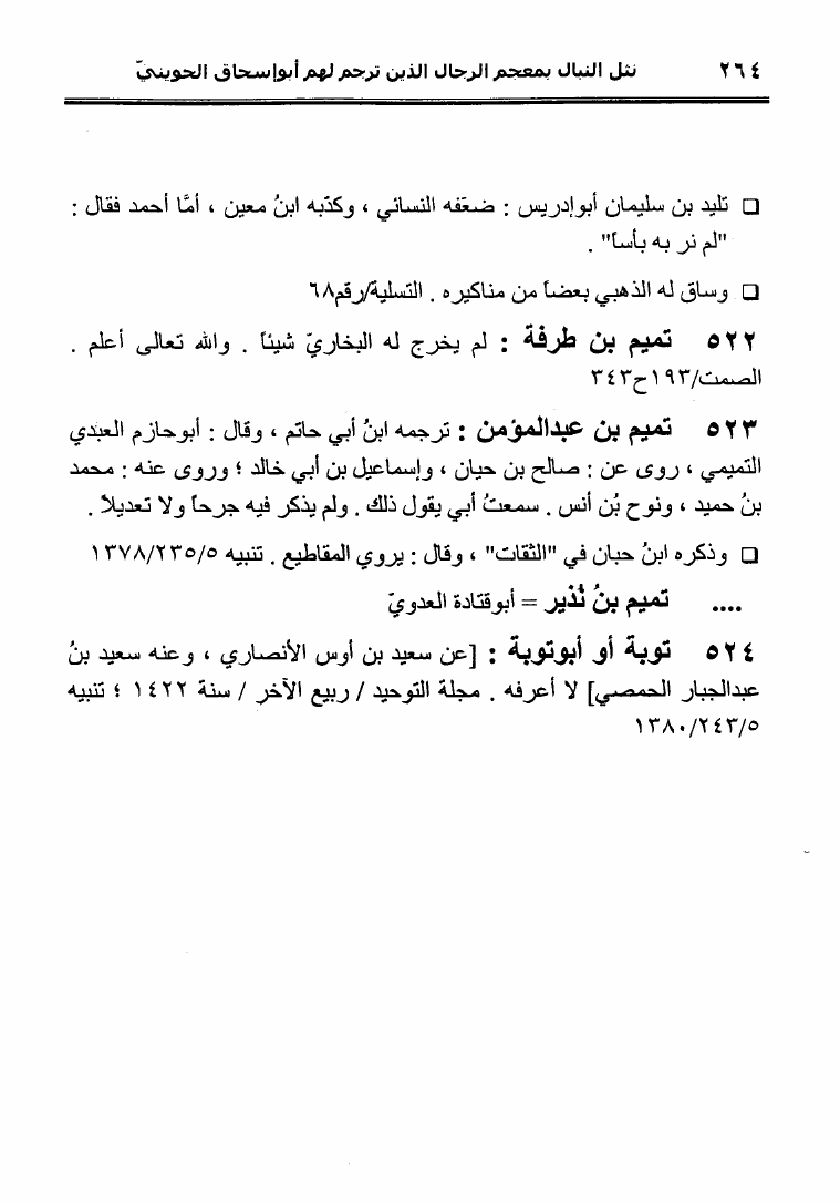 نام کتاب : نثل النبال بمعجم الرجال الذين ترجم لهم فضيلة الشيخ المحدث أبو إسحاق الحويني (ط. المحدثين) نویسنده : أحمد بن عطية الوكيل أبو عمرو جلد : 1 صفحه : 264