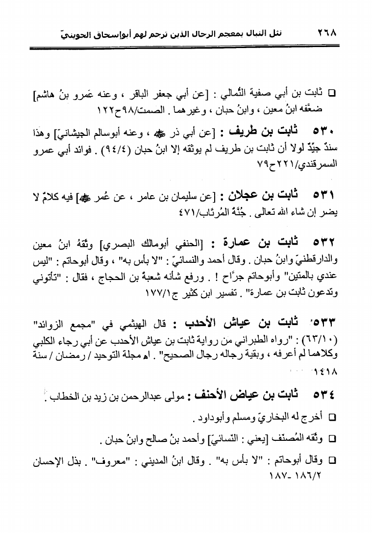 نام کتاب : نثل النبال بمعجم الرجال الذين ترجم لهم فضيلة الشيخ المحدث أبو إسحاق الحويني (ط. المحدثين) نویسنده : أحمد بن عطية الوكيل أبو عمرو جلد : 1 صفحه : 268