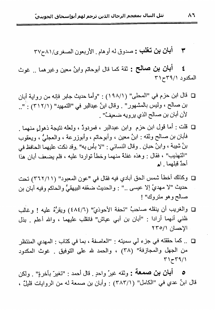 نام کتاب : نثل النبال بمعجم الرجال الذين ترجم لهم فضيلة الشيخ المحدث أبو إسحاق الحويني (ط. المحدثين) نویسنده : أحمد بن عطية الوكيل أبو عمرو جلد : 1 صفحه : 86