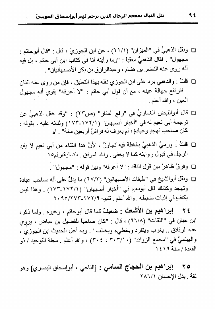 نام کتاب : نثل النبال بمعجم الرجال الذين ترجم لهم فضيلة الشيخ المحدث أبو إسحاق الحويني (ط. المحدثين) نویسنده : أحمد بن عطية الوكيل أبو عمرو جلد : 1 صفحه : 94