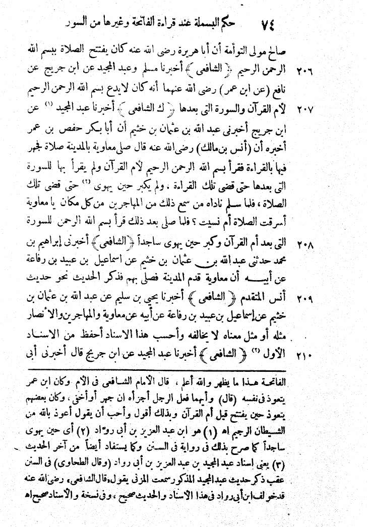 نام کتاب : بدائع المنن في جمع وترتيب مسند الشافعي والسنن، مذيلاً بالقول الحسن شرح بدائع المنن نویسنده : أحمد عبد الرحمن البنا الساعاتي جلد : 1 صفحه : 74
