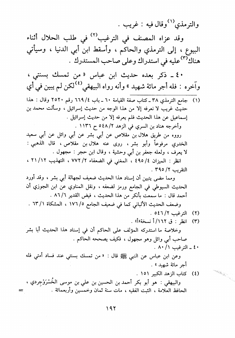 نام کتاب : عجالة الإملاء المتيسرة من التذنيب على ما وقع للحافظ المنذري من الوهم وغيره في كتابه الترغيب والترهيب (ط المعارف) نویسنده : الناجي جلد : 1 صفحه : 192