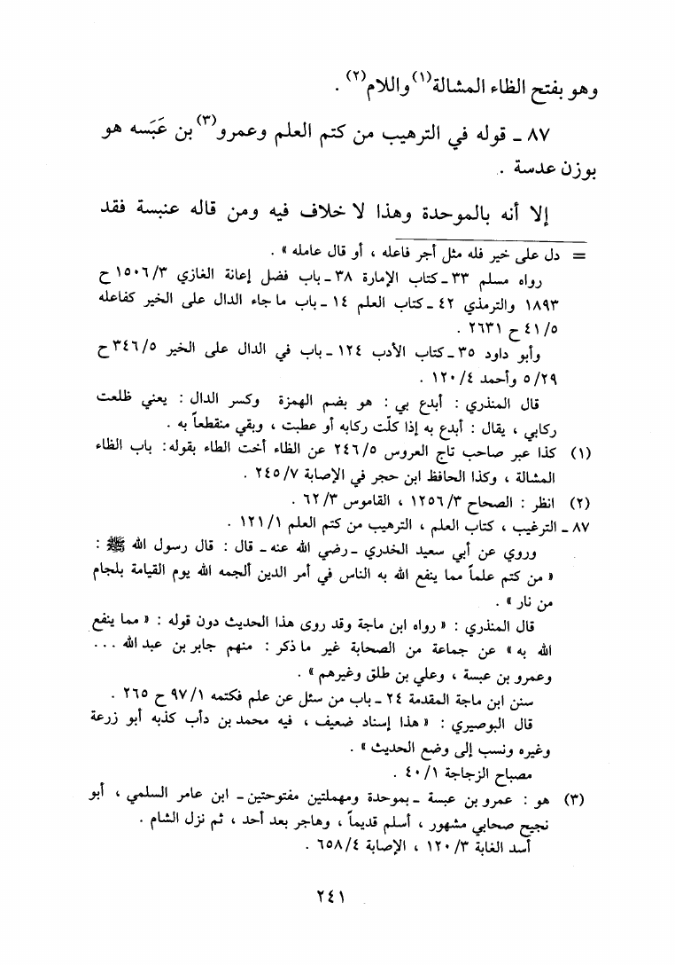نام کتاب : عجالة الإملاء المتيسرة من التذنيب على ما وقع للحافظ المنذري من الوهم وغيره في كتابه الترغيب والترهيب (ط المعارف) نویسنده : الناجي جلد : 1 صفحه : 241