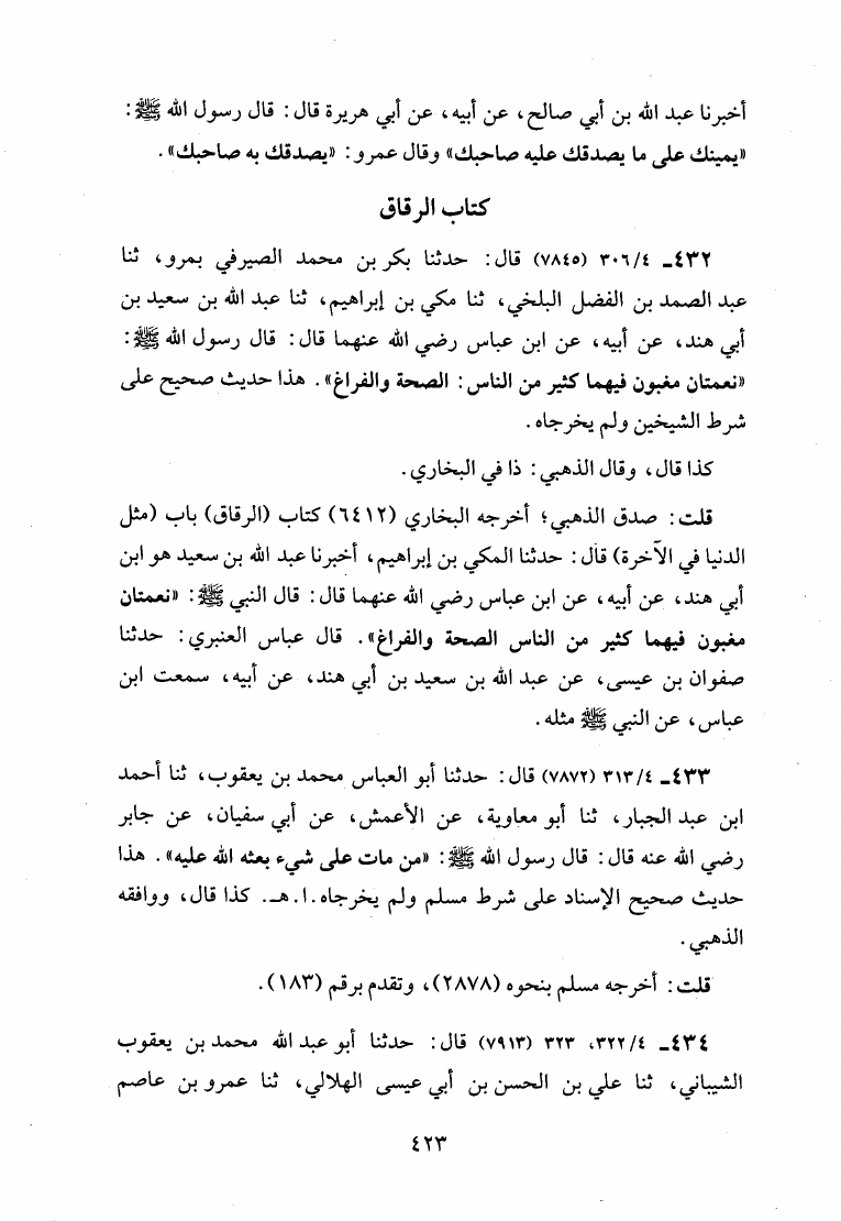 الانتباه لما قال الحاكم ولم يخرجاه وهو في أحدهما أو روياه (ط. الأوقاف القطرية)
