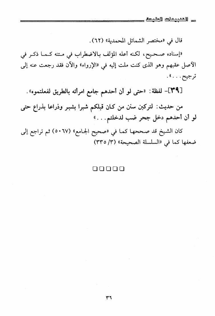 نام کتاب : التنبيهات المليحة على ما تراجع عنه العلامة المحدث الألباني من الأحاديث الضعيفة أو الصحيحة نویسنده : عبد الباسط بن يوسف الغريب جلد : 1 صفحه : 36