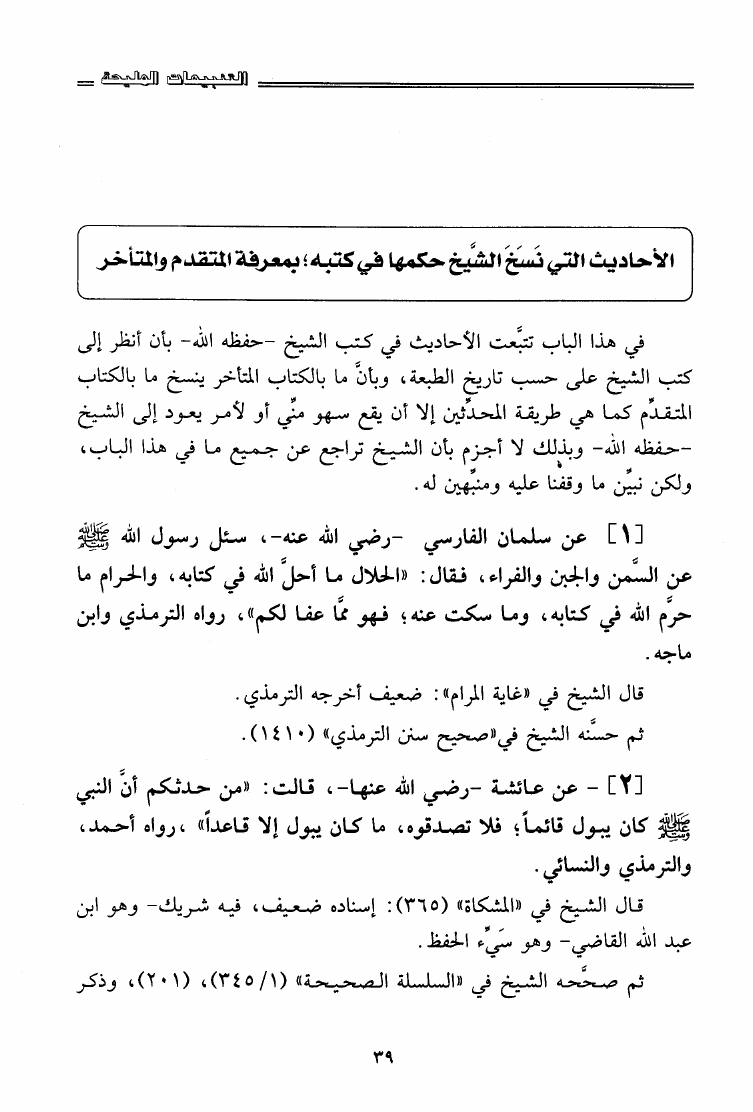 نام کتاب : التنبيهات المليحة على ما تراجع عنه العلامة المحدث الألباني من الأحاديث الضعيفة أو الصحيحة نویسنده : عبد الباسط بن يوسف الغريب جلد : 1 صفحه : 39