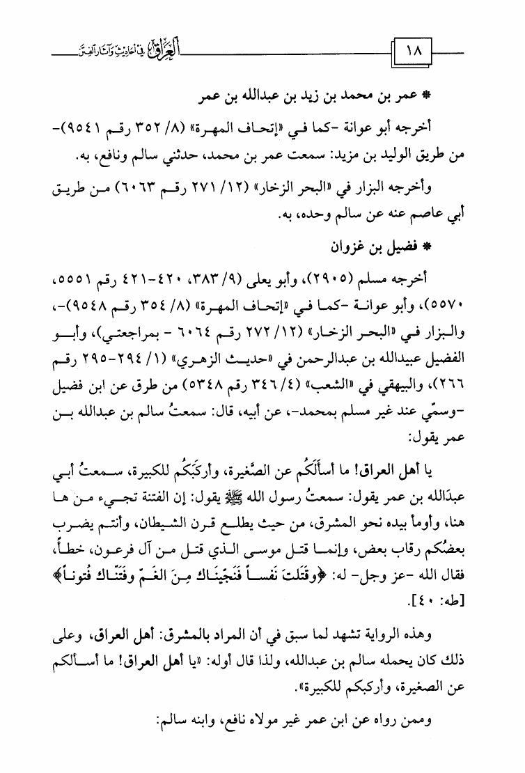 نام کتاب : العراق في أحاديث وآثار الفتن وفي آخره دراسة تأصيلية لظاهرة إسقاط الفتن على الوقائع وتقويم الدراسات الحديثة التي خاضت في ذلك وبيان مزالقها وانحرافها نویسنده : مشهور بن حسن آل سلمان ابو عبيدة جلد : 1 صفحه : 18
