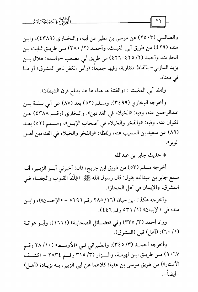 نام کتاب : العراق في أحاديث وآثار الفتن وفي آخره دراسة تأصيلية لظاهرة إسقاط الفتن على الوقائع وتقويم الدراسات الحديثة التي خاضت في ذلك وبيان مزالقها وانحرافها نویسنده : مشهور بن حسن آل سلمان ابو عبيدة جلد : 1 صفحه : 22