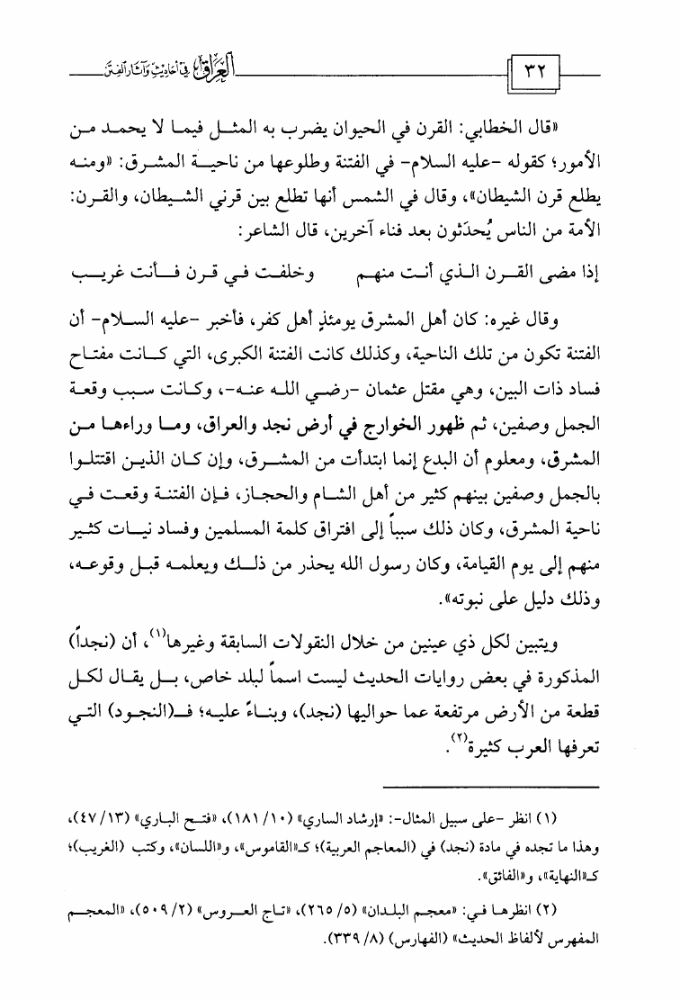 نام کتاب : العراق في أحاديث وآثار الفتن وفي آخره دراسة تأصيلية لظاهرة إسقاط الفتن على الوقائع وتقويم الدراسات الحديثة التي خاضت في ذلك وبيان مزالقها وانحرافها نویسنده : مشهور بن حسن آل سلمان ابو عبيدة جلد : 1 صفحه : 32