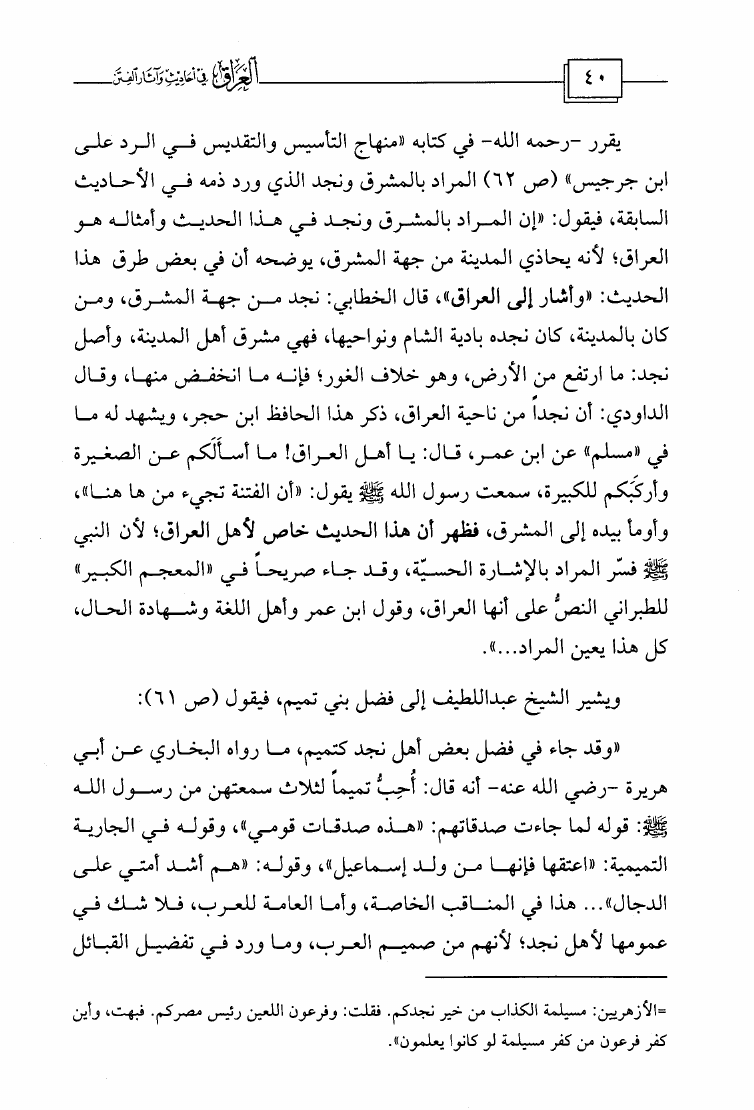 نام کتاب : العراق في أحاديث وآثار الفتن وفي آخره دراسة تأصيلية لظاهرة إسقاط الفتن على الوقائع وتقويم الدراسات الحديثة التي خاضت في ذلك وبيان مزالقها وانحرافها نویسنده : مشهور بن حسن آل سلمان ابو عبيدة جلد : 1 صفحه : 40