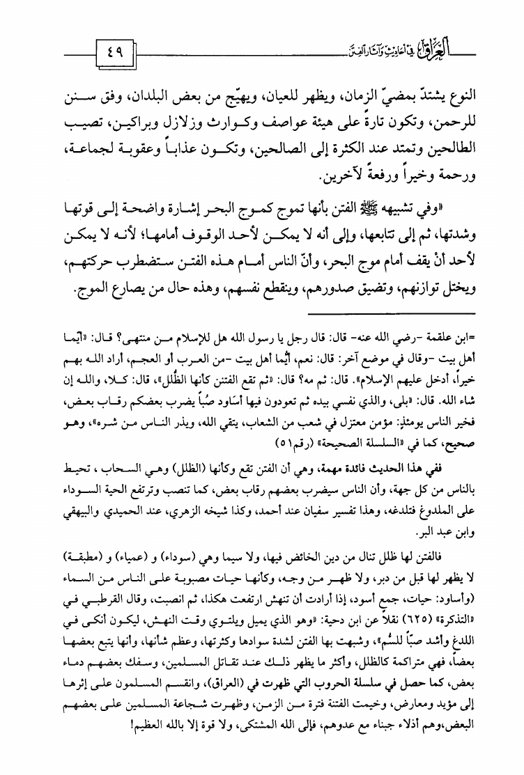 نام کتاب : العراق في أحاديث وآثار الفتن وفي آخره دراسة تأصيلية لظاهرة إسقاط الفتن على الوقائع وتقويم الدراسات الحديثة التي خاضت في ذلك وبيان مزالقها وانحرافها نویسنده : مشهور بن حسن آل سلمان ابو عبيدة جلد : 1 صفحه : 49