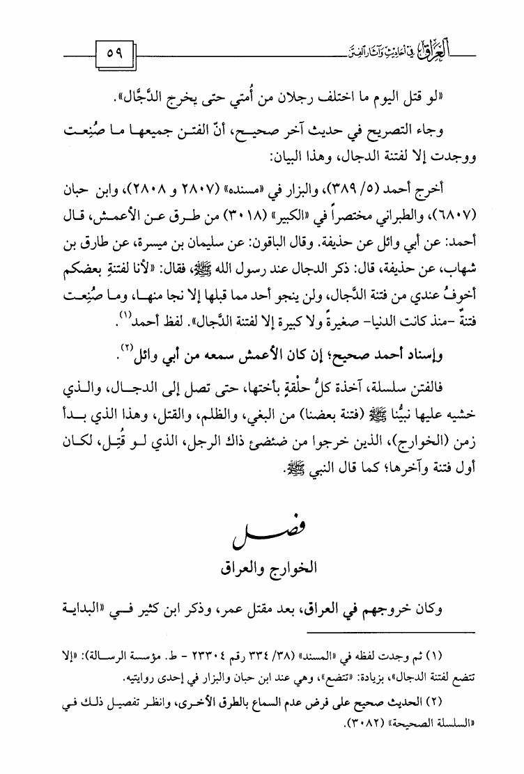نام کتاب : العراق في أحاديث وآثار الفتن وفي آخره دراسة تأصيلية لظاهرة إسقاط الفتن على الوقائع وتقويم الدراسات الحديثة التي خاضت في ذلك وبيان مزالقها وانحرافها نویسنده : مشهور بن حسن آل سلمان ابو عبيدة جلد : 1 صفحه : 59