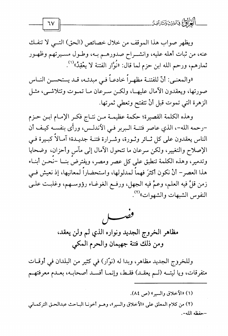 نام کتاب : العراق في أحاديث وآثار الفتن وفي آخره دراسة تأصيلية لظاهرة إسقاط الفتن على الوقائع وتقويم الدراسات الحديثة التي خاضت في ذلك وبيان مزالقها وانحرافها نویسنده : مشهور بن حسن آل سلمان ابو عبيدة جلد : 1 صفحه : 67
