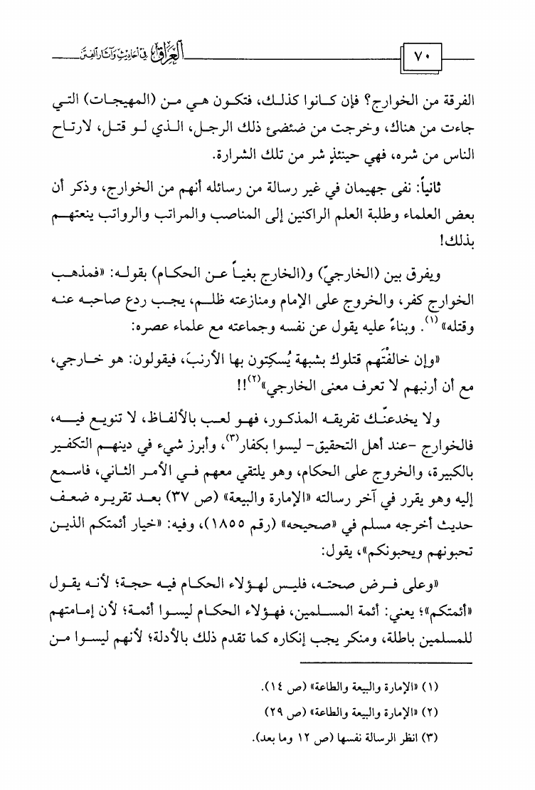 نام کتاب : العراق في أحاديث وآثار الفتن وفي آخره دراسة تأصيلية لظاهرة إسقاط الفتن على الوقائع وتقويم الدراسات الحديثة التي خاضت في ذلك وبيان مزالقها وانحرافها نویسنده : مشهور بن حسن آل سلمان ابو عبيدة جلد : 1 صفحه : 70