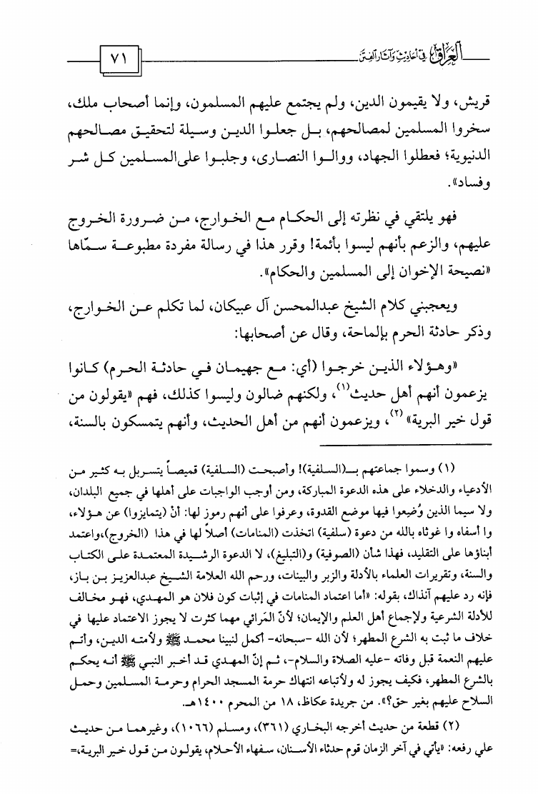نام کتاب : العراق في أحاديث وآثار الفتن وفي آخره دراسة تأصيلية لظاهرة إسقاط الفتن على الوقائع وتقويم الدراسات الحديثة التي خاضت في ذلك وبيان مزالقها وانحرافها نویسنده : مشهور بن حسن آل سلمان ابو عبيدة جلد : 1 صفحه : 71