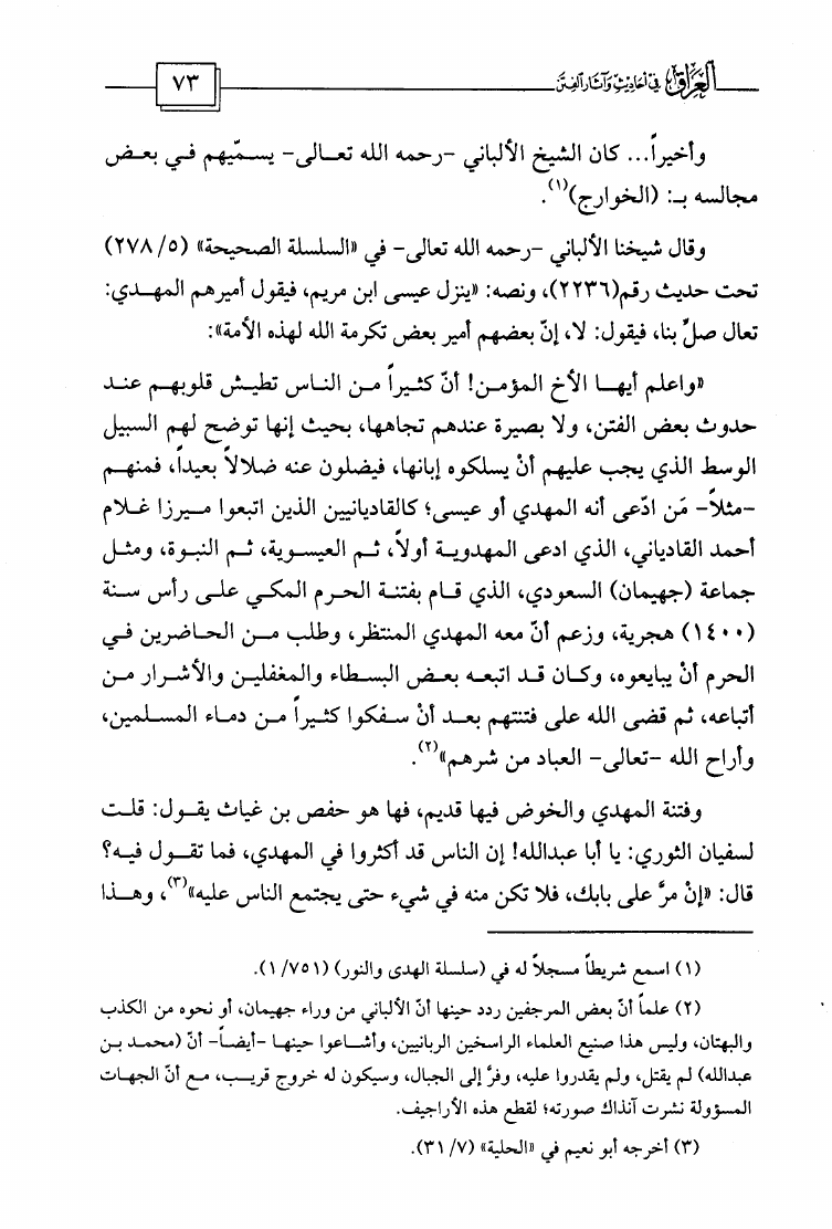 نام کتاب : العراق في أحاديث وآثار الفتن وفي آخره دراسة تأصيلية لظاهرة إسقاط الفتن على الوقائع وتقويم الدراسات الحديثة التي خاضت في ذلك وبيان مزالقها وانحرافها نویسنده : مشهور بن حسن آل سلمان ابو عبيدة جلد : 1 صفحه : 73