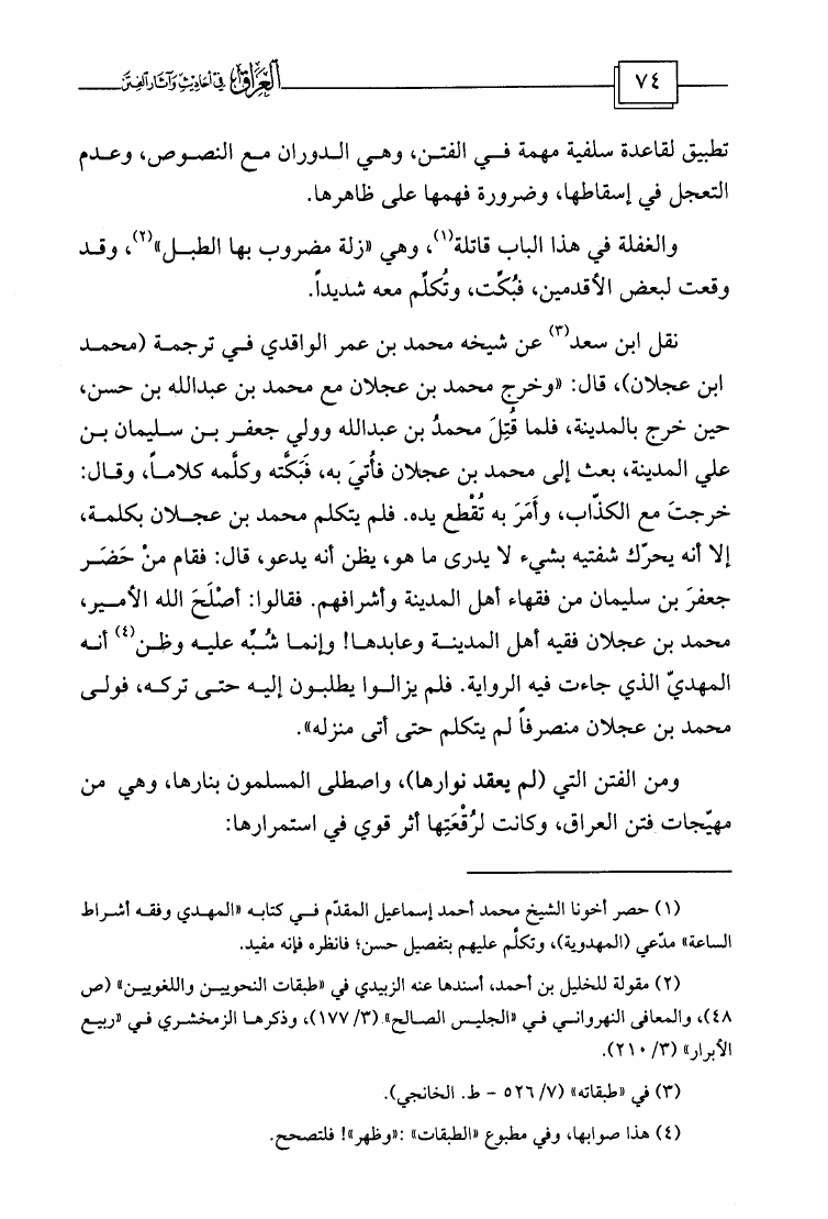 نام کتاب : العراق في أحاديث وآثار الفتن وفي آخره دراسة تأصيلية لظاهرة إسقاط الفتن على الوقائع وتقويم الدراسات الحديثة التي خاضت في ذلك وبيان مزالقها وانحرافها نویسنده : مشهور بن حسن آل سلمان ابو عبيدة جلد : 1 صفحه : 74