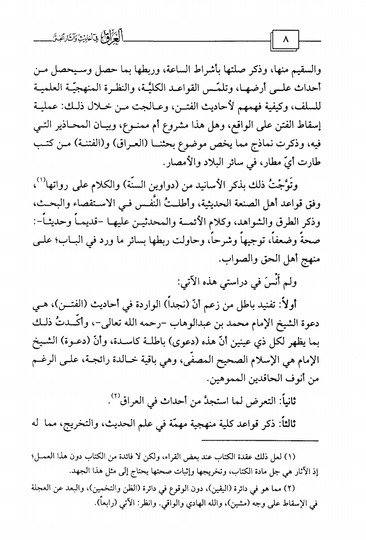 نام کتاب : العراق في أحاديث وآثار الفتن وفي آخره دراسة تأصيلية لظاهرة إسقاط الفتن على الوقائع وتقويم الدراسات الحديثة التي خاضت في ذلك وبيان مزالقها وانحرافها نویسنده : مشهور بن حسن آل سلمان ابو عبيدة جلد : 1 صفحه : 8