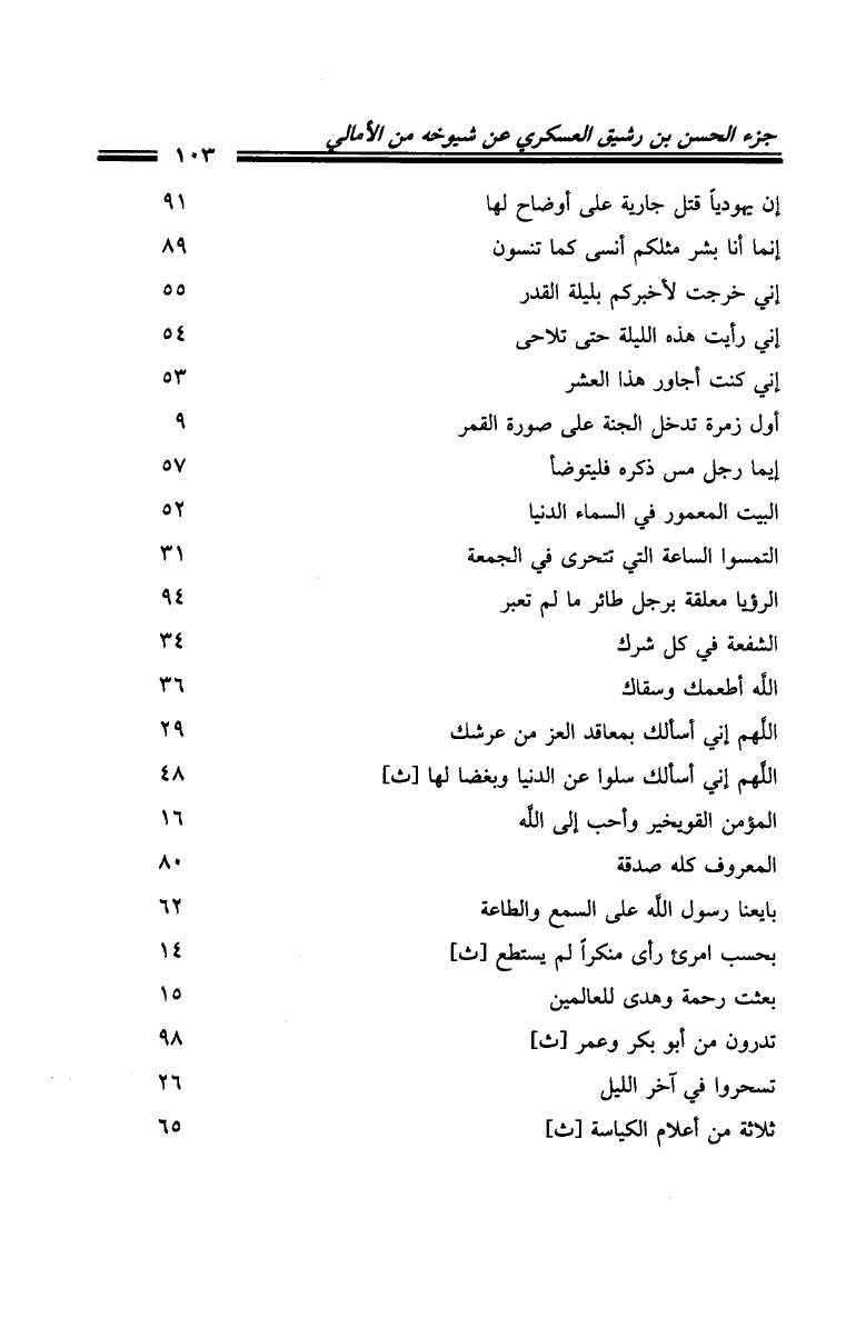 نام کتاب : مجموع فيه ثلاثة من الأجزاء الحديثية: جزء الحسن بن رشيق العسكري عن شيوخه من الأمالي - جزء أبي العباس رافع بن عصم بن العباس بن أحمد العصمي - جزء فيه مصافحة الإمام مسلم والإمام النسائي نویسنده : الحسن رشيق العسكري - رافع بن عصم - عبد المؤمن الدمياطي جلد : 1 صفحه : 103