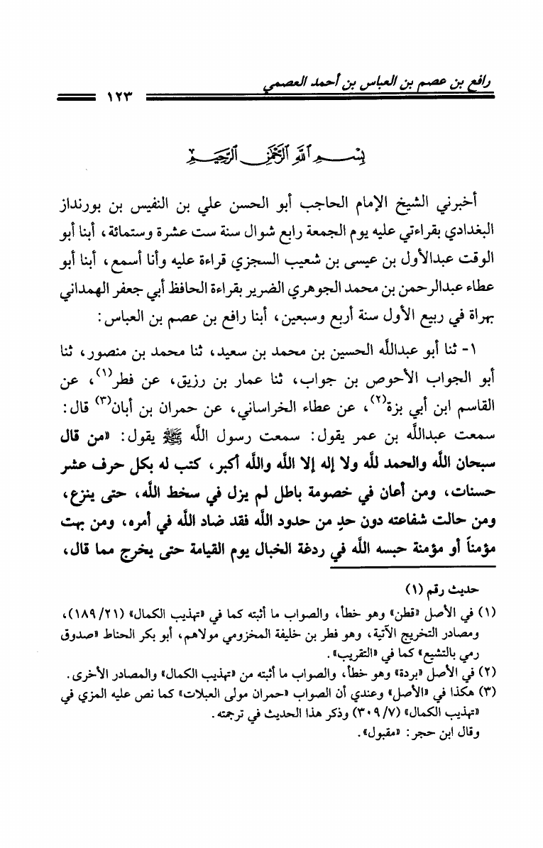 نام کتاب : مجموع فيه ثلاثة من الأجزاء الحديثية: جزء الحسن بن رشيق العسكري عن شيوخه من الأمالي - جزء أبي العباس رافع بن عصم بن العباس بن أحمد العصمي - جزء فيه مصافحة الإمام مسلم والإمام النسائي نویسنده : الحسن رشيق العسكري - رافع بن عصم - عبد المؤمن الدمياطي جلد : 1 صفحه : 123