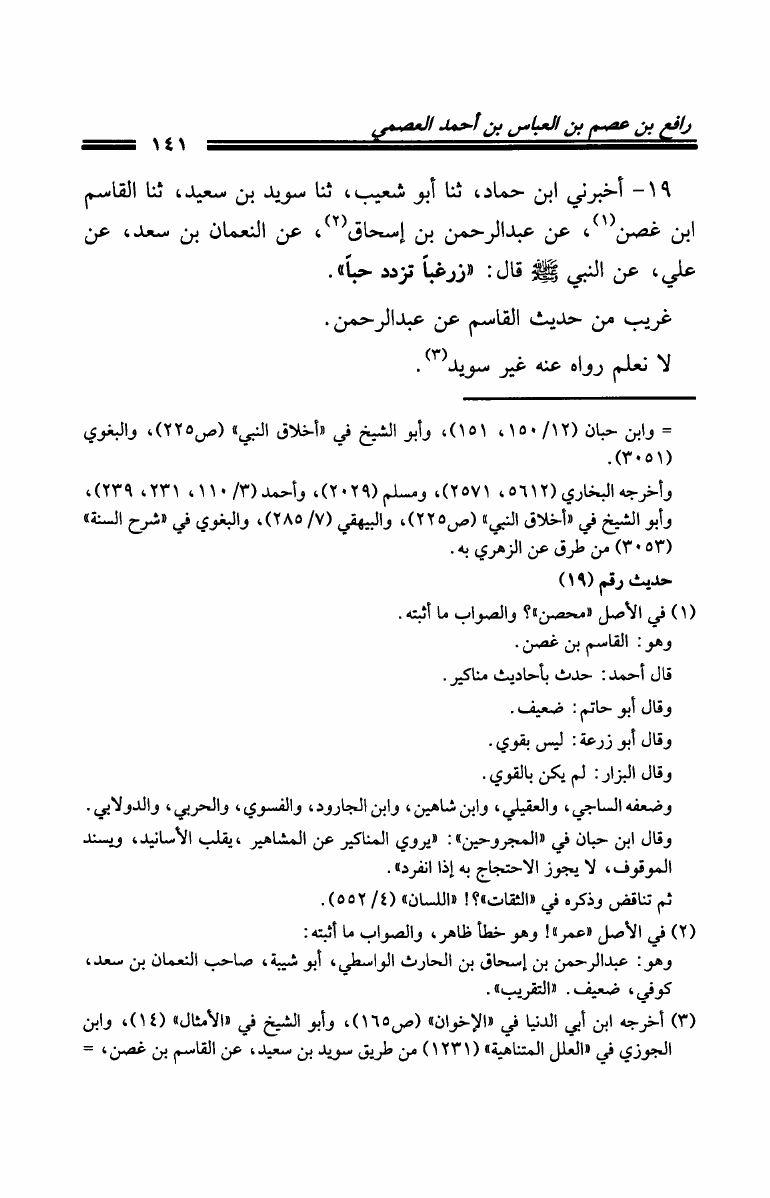 نام کتاب : مجموع فيه ثلاثة من الأجزاء الحديثية: جزء الحسن بن رشيق العسكري عن شيوخه من الأمالي - جزء أبي العباس رافع بن عصم بن العباس بن أحمد العصمي - جزء فيه مصافحة الإمام مسلم والإمام النسائي نویسنده : الحسن رشيق العسكري - رافع بن عصم - عبد المؤمن الدمياطي جلد : 1 صفحه : 141