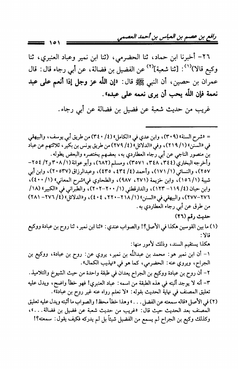 نام کتاب : مجموع فيه ثلاثة من الأجزاء الحديثية: جزء الحسن بن رشيق العسكري عن شيوخه من الأمالي - جزء أبي العباس رافع بن عصم بن العباس بن أحمد العصمي - جزء فيه مصافحة الإمام مسلم والإمام النسائي نویسنده : الحسن رشيق العسكري - رافع بن عصم - عبد المؤمن الدمياطي جلد : 1 صفحه : 151