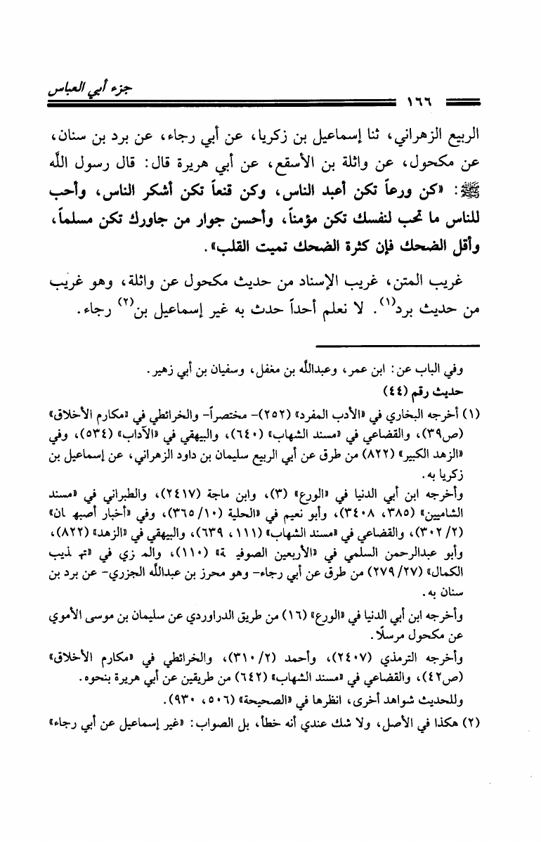 نام کتاب : مجموع فيه ثلاثة من الأجزاء الحديثية: جزء الحسن بن رشيق العسكري عن شيوخه من الأمالي - جزء أبي العباس رافع بن عصم بن العباس بن أحمد العصمي - جزء فيه مصافحة الإمام مسلم والإمام النسائي نویسنده : الحسن رشيق العسكري - رافع بن عصم - عبد المؤمن الدمياطي جلد : 1 صفحه : 166