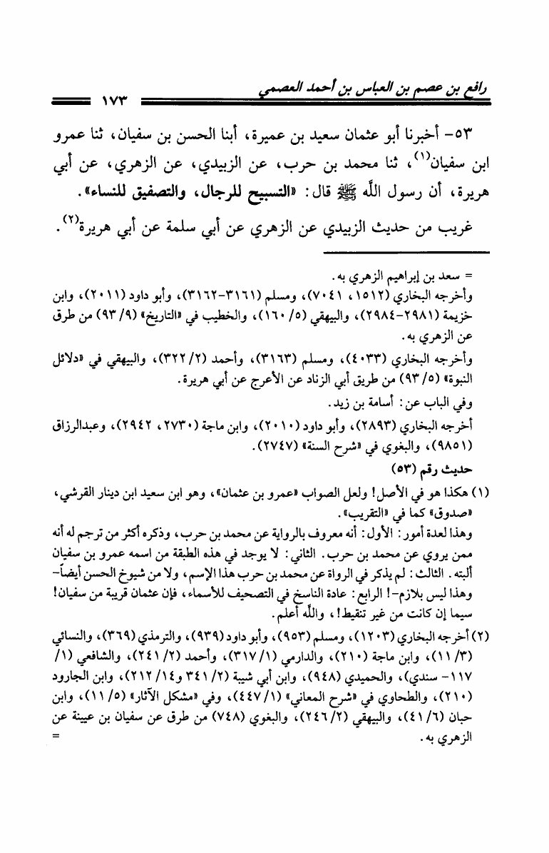 نام کتاب : مجموع فيه ثلاثة من الأجزاء الحديثية: جزء الحسن بن رشيق العسكري عن شيوخه من الأمالي - جزء أبي العباس رافع بن عصم بن العباس بن أحمد العصمي - جزء فيه مصافحة الإمام مسلم والإمام النسائي نویسنده : الحسن رشيق العسكري - رافع بن عصم - عبد المؤمن الدمياطي جلد : 1 صفحه : 173