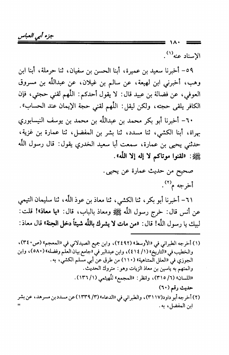 نام کتاب : مجموع فيه ثلاثة من الأجزاء الحديثية: جزء الحسن بن رشيق العسكري عن شيوخه من الأمالي - جزء أبي العباس رافع بن عصم بن العباس بن أحمد العصمي - جزء فيه مصافحة الإمام مسلم والإمام النسائي نویسنده : الحسن رشيق العسكري - رافع بن عصم - عبد المؤمن الدمياطي جلد : 1 صفحه : 180