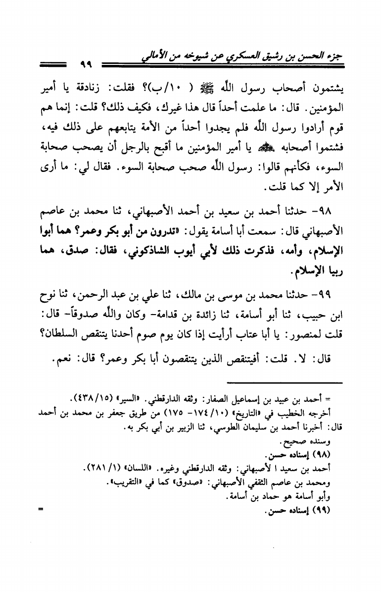 نام کتاب : مجموع فيه ثلاثة من الأجزاء الحديثية: جزء الحسن بن رشيق العسكري عن شيوخه من الأمالي - جزء أبي العباس رافع بن عصم بن العباس بن أحمد العصمي - جزء فيه مصافحة الإمام مسلم والإمام النسائي نویسنده : الحسن رشيق العسكري - رافع بن عصم - عبد المؤمن الدمياطي جلد : 1 صفحه : 99