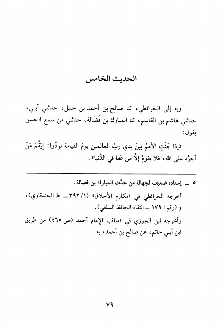 نام کتاب : مجموع فيه جواب بعض الخدم لأهل النعم عن تصحيف حديث احتجم، ويليه العشرة من مرويات صالح ابن الإمام أحمد وزيادتها، ويليه جزء فيه إسلام زيد بن حارثة وغيره من أحاديث الشيوخ نویسنده : يوسف بن عبد الهادي الصالحي ابن المبرد - تمام بن محمد الرازي جلد : 1 صفحه : 79