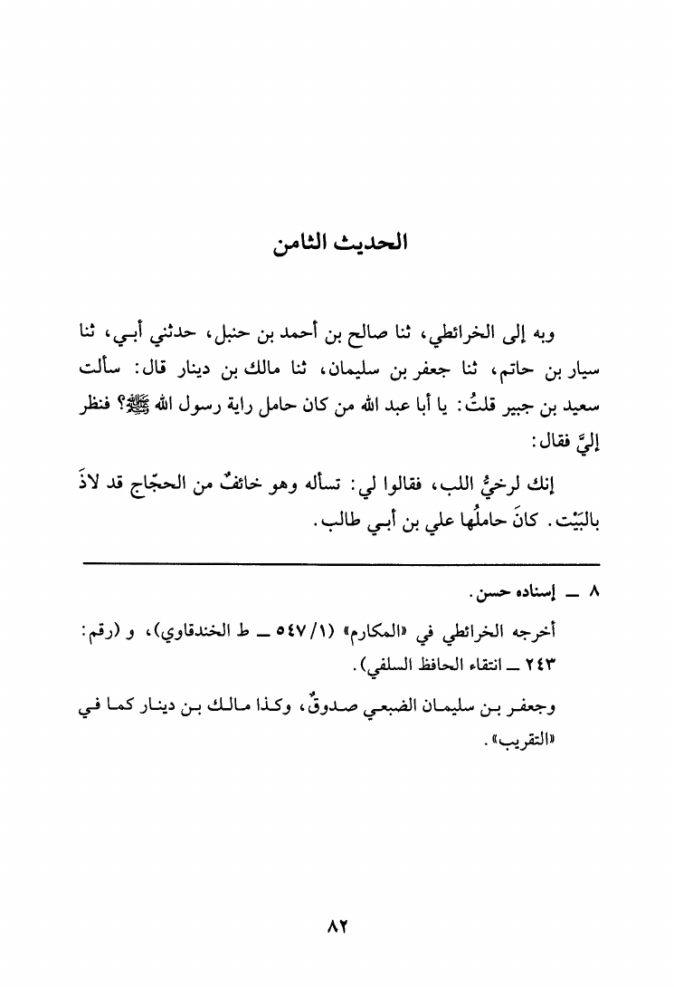 نام کتاب : مجموع فيه جواب بعض الخدم لأهل النعم عن تصحيف حديث احتجم، ويليه العشرة من مرويات صالح ابن الإمام أحمد وزيادتها، ويليه جزء فيه إسلام زيد بن حارثة وغيره من أحاديث الشيوخ نویسنده : يوسف بن عبد الهادي الصالحي ابن المبرد - تمام بن محمد الرازي جلد : 1 صفحه : 82