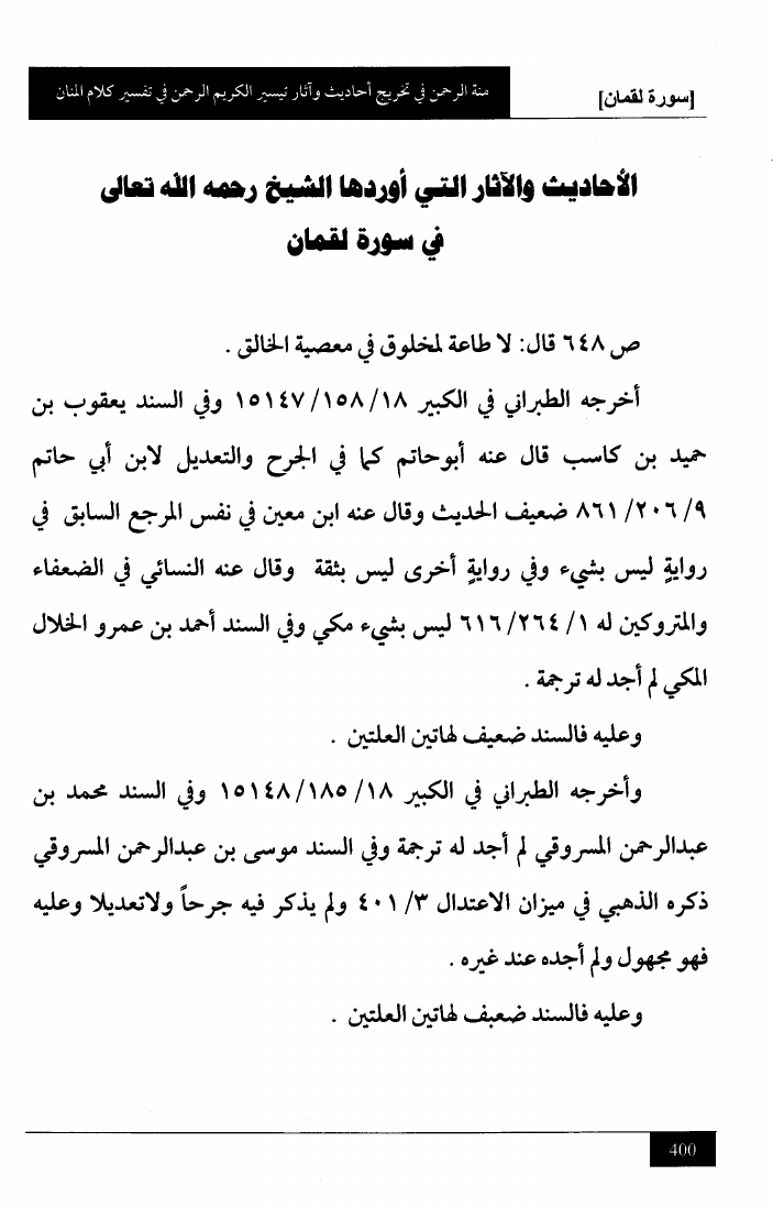 منة الرحمن في تخريج أحاديث وآثار تيسير الكريم الرحمن في تفسير كلام المنان