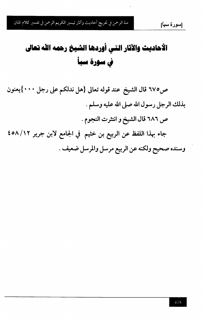 منة الرحمن في تخريج أحاديث وآثار تيسير الكريم الرحمن في تفسير كلام المنان