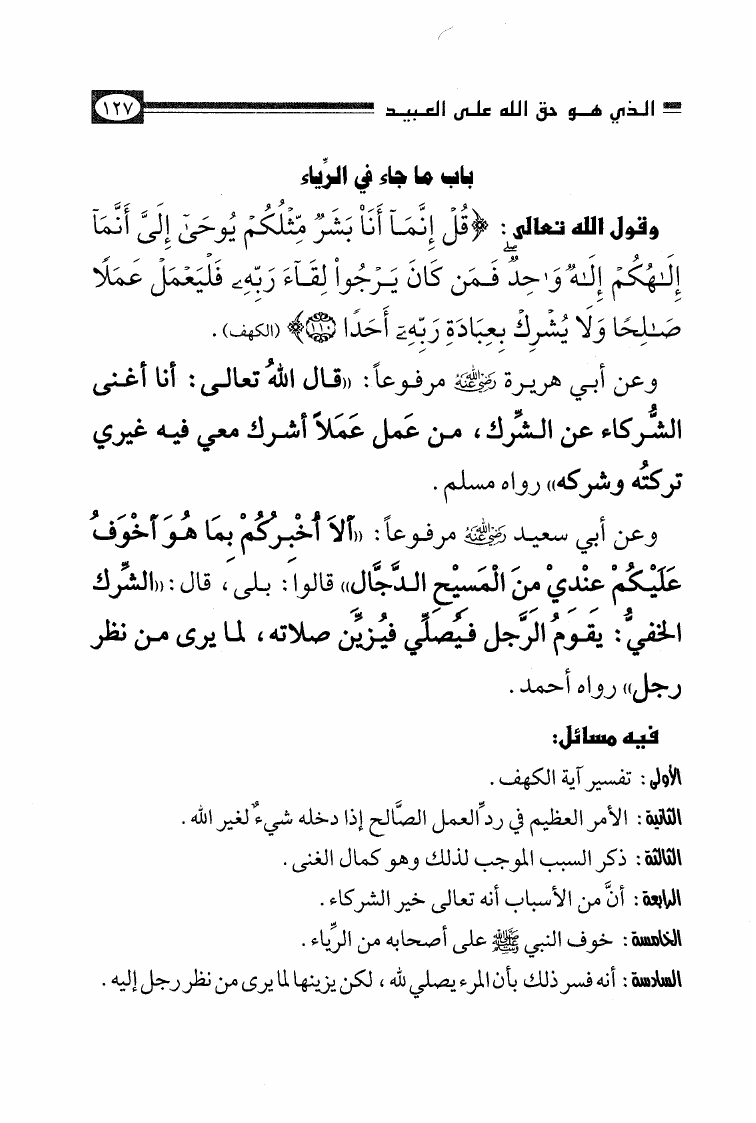 نام کتاب : الأصول الثلاثة وشروط الصلاة والقواعد الأربع وكتاب التوحيد وكشف الشبهات والواجبات المتحتمات والأربعون النووية نویسنده : محمد بن عبد الوهاب جلد : 1 صفحه : 127