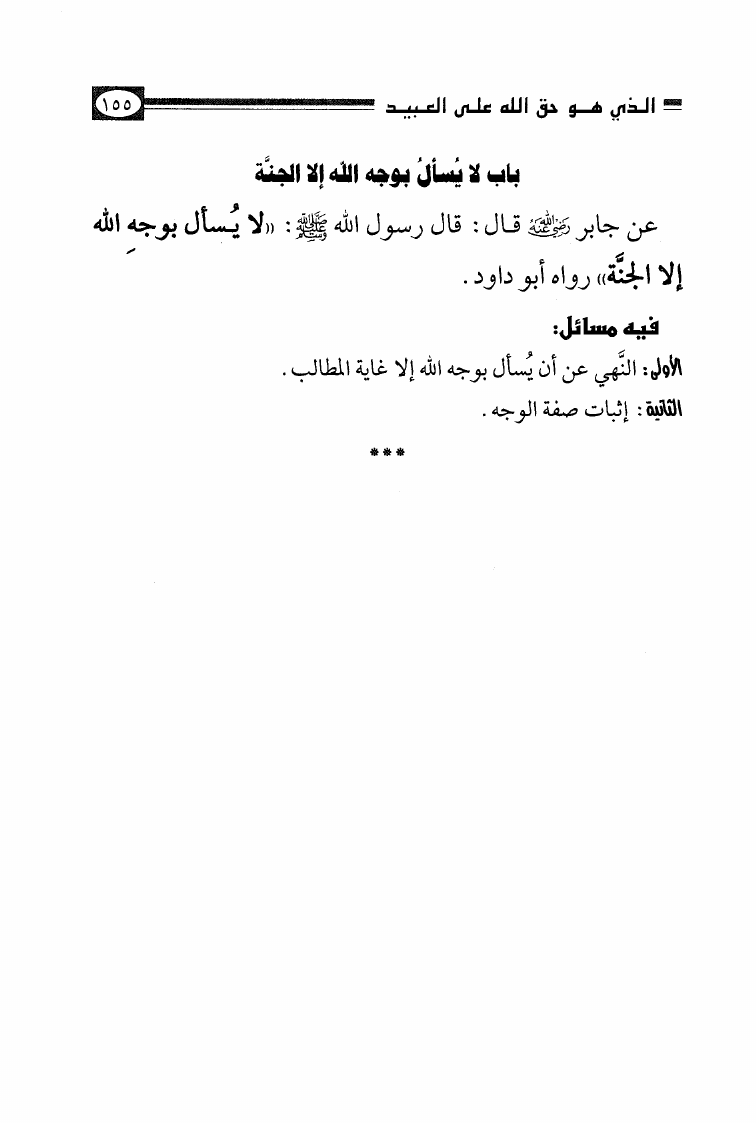 نام کتاب : الأصول الثلاثة وشروط الصلاة والقواعد الأربع وكتاب التوحيد وكشف الشبهات والواجبات المتحتمات والأربعون النووية نویسنده : محمد بن عبد الوهاب جلد : 1 صفحه : 155