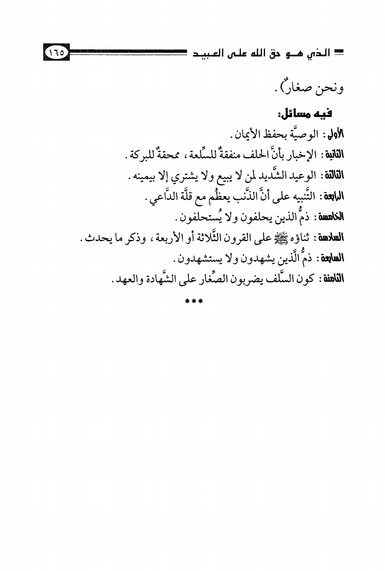 نام کتاب : الأصول الثلاثة وشروط الصلاة والقواعد الأربع وكتاب التوحيد وكشف الشبهات والواجبات المتحتمات والأربعون النووية نویسنده : محمد بن عبد الوهاب جلد : 1 صفحه : 165