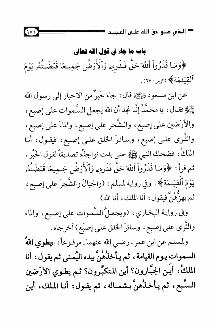نام کتاب : الأصول الثلاثة وشروط الصلاة والقواعد الأربع وكتاب التوحيد وكشف الشبهات والواجبات المتحتمات والأربعون النووية نویسنده : محمد بن عبد الوهاب جلد : 1 صفحه : 171