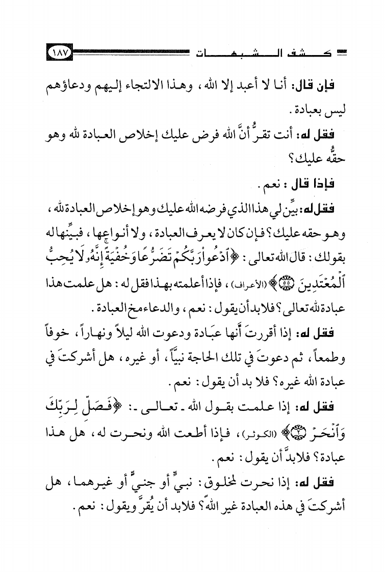 نام کتاب : الأصول الثلاثة وشروط الصلاة والقواعد الأربع وكتاب التوحيد وكشف الشبهات والواجبات المتحتمات والأربعون النووية نویسنده : محمد بن عبد الوهاب جلد : 1 صفحه : 187