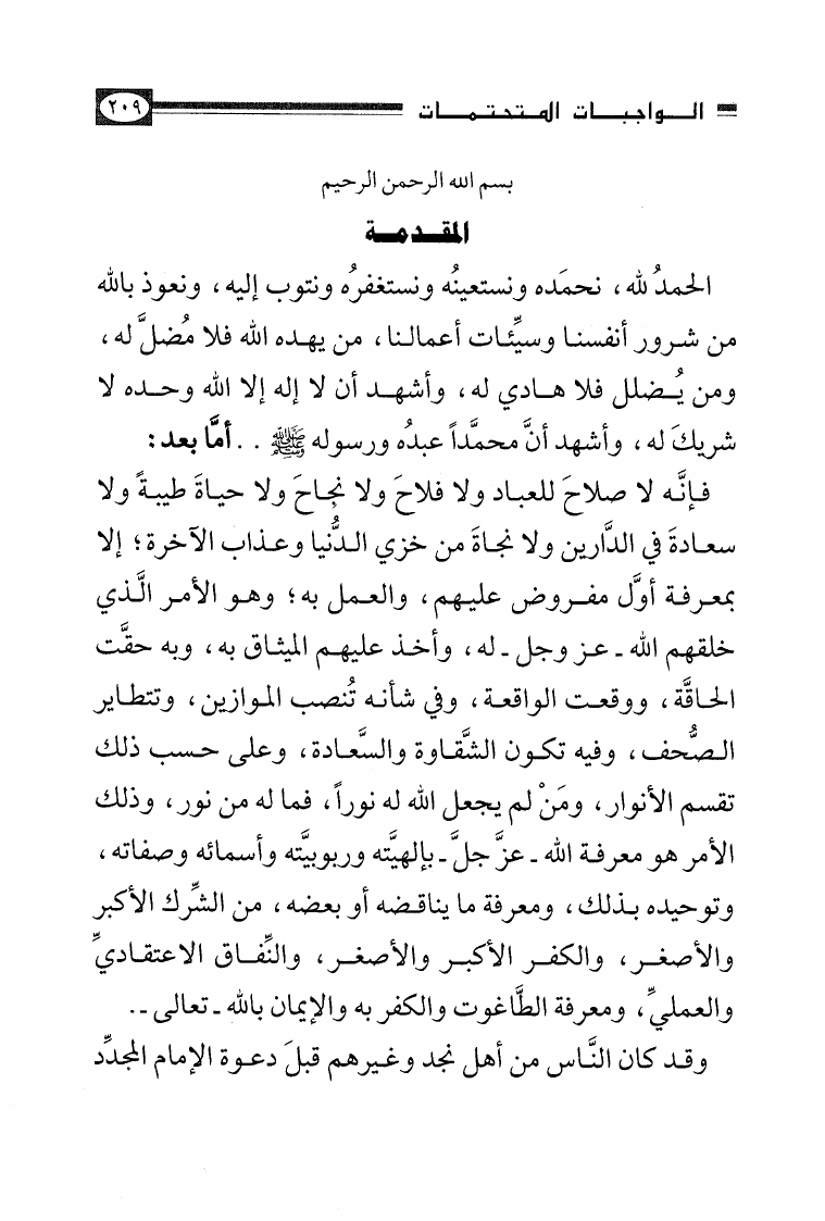 نام کتاب : الأصول الثلاثة وشروط الصلاة والقواعد الأربع وكتاب التوحيد وكشف الشبهات والواجبات المتحتمات والأربعون النووية نویسنده : محمد بن عبد الوهاب جلد : 1 صفحه : 209