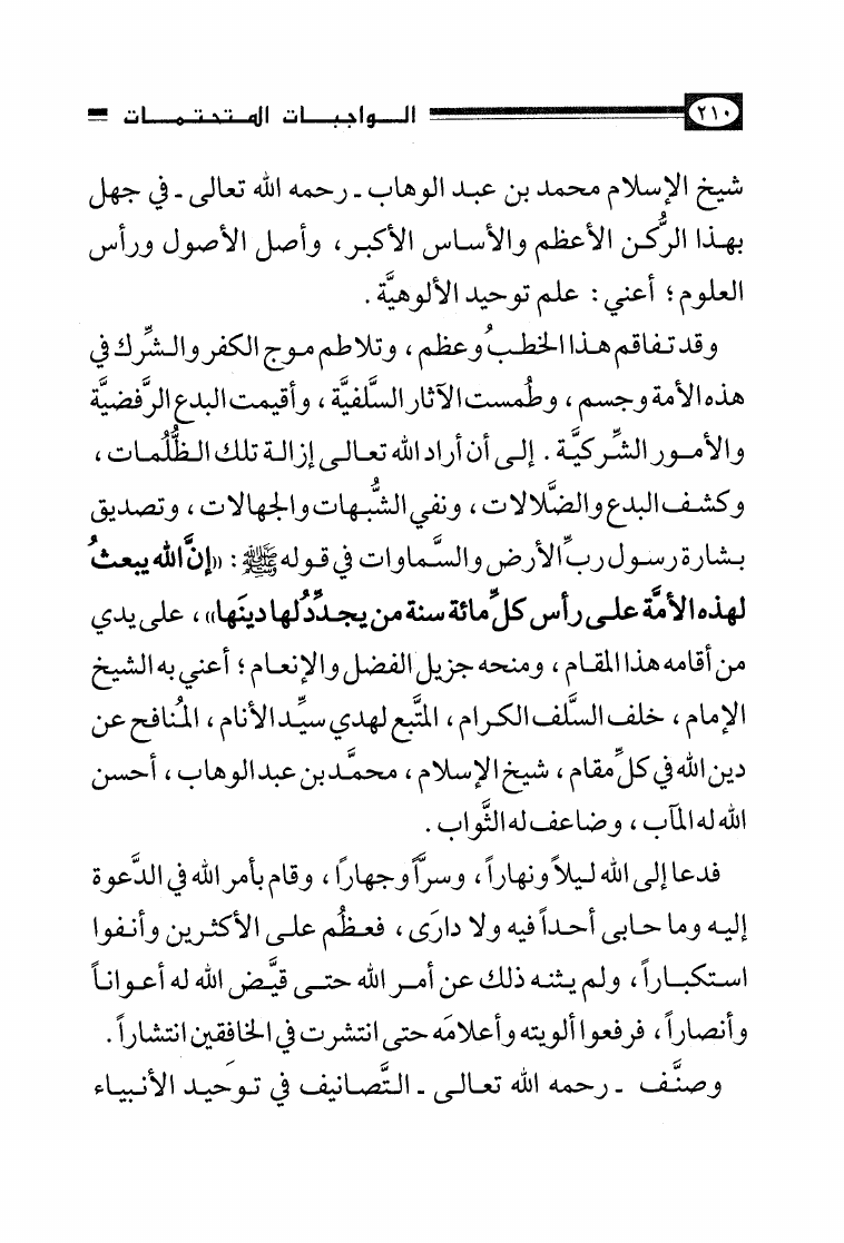 نام کتاب : الأصول الثلاثة وشروط الصلاة والقواعد الأربع وكتاب التوحيد وكشف الشبهات والواجبات المتحتمات والأربعون النووية نویسنده : محمد بن عبد الوهاب جلد : 1 صفحه : 210