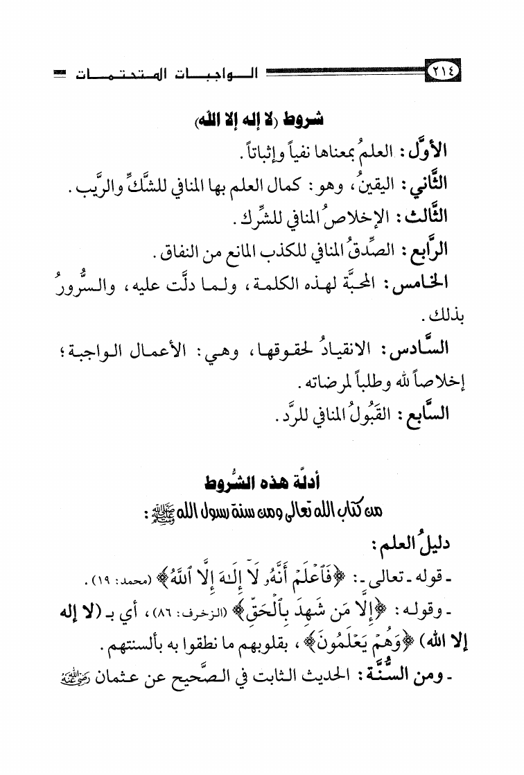نام کتاب : الأصول الثلاثة وشروط الصلاة والقواعد الأربع وكتاب التوحيد وكشف الشبهات والواجبات المتحتمات والأربعون النووية نویسنده : محمد بن عبد الوهاب جلد : 1 صفحه : 214