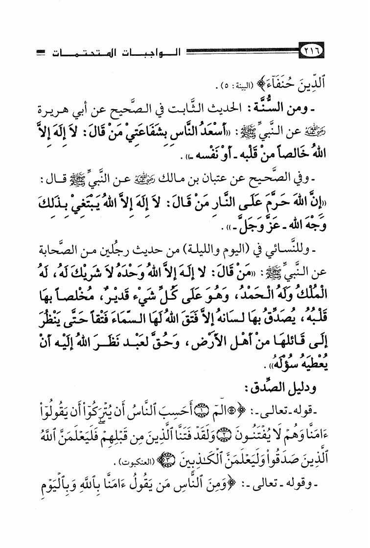 نام کتاب : الأصول الثلاثة وشروط الصلاة والقواعد الأربع وكتاب التوحيد وكشف الشبهات والواجبات المتحتمات والأربعون النووية نویسنده : محمد بن عبد الوهاب جلد : 1 صفحه : 216