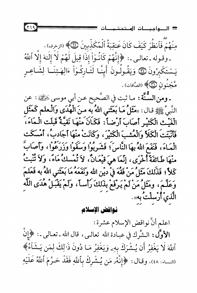نام کتاب : الأصول الثلاثة وشروط الصلاة والقواعد الأربع وكتاب التوحيد وكشف الشبهات والواجبات المتحتمات والأربعون النووية نویسنده : محمد بن عبد الوهاب جلد : 1 صفحه : 219