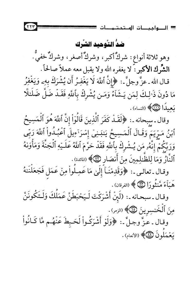 نام کتاب : الأصول الثلاثة وشروط الصلاة والقواعد الأربع وكتاب التوحيد وكشف الشبهات والواجبات المتحتمات والأربعون النووية نویسنده : محمد بن عبد الوهاب جلد : 1 صفحه : 223