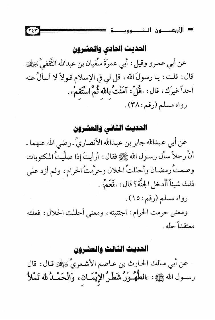 نام کتاب : الأصول الثلاثة وشروط الصلاة والقواعد الأربع وكتاب التوحيد وكشف الشبهات والواجبات المتحتمات والأربعون النووية نویسنده : محمد بن عبد الوهاب جلد : 1 صفحه : 243