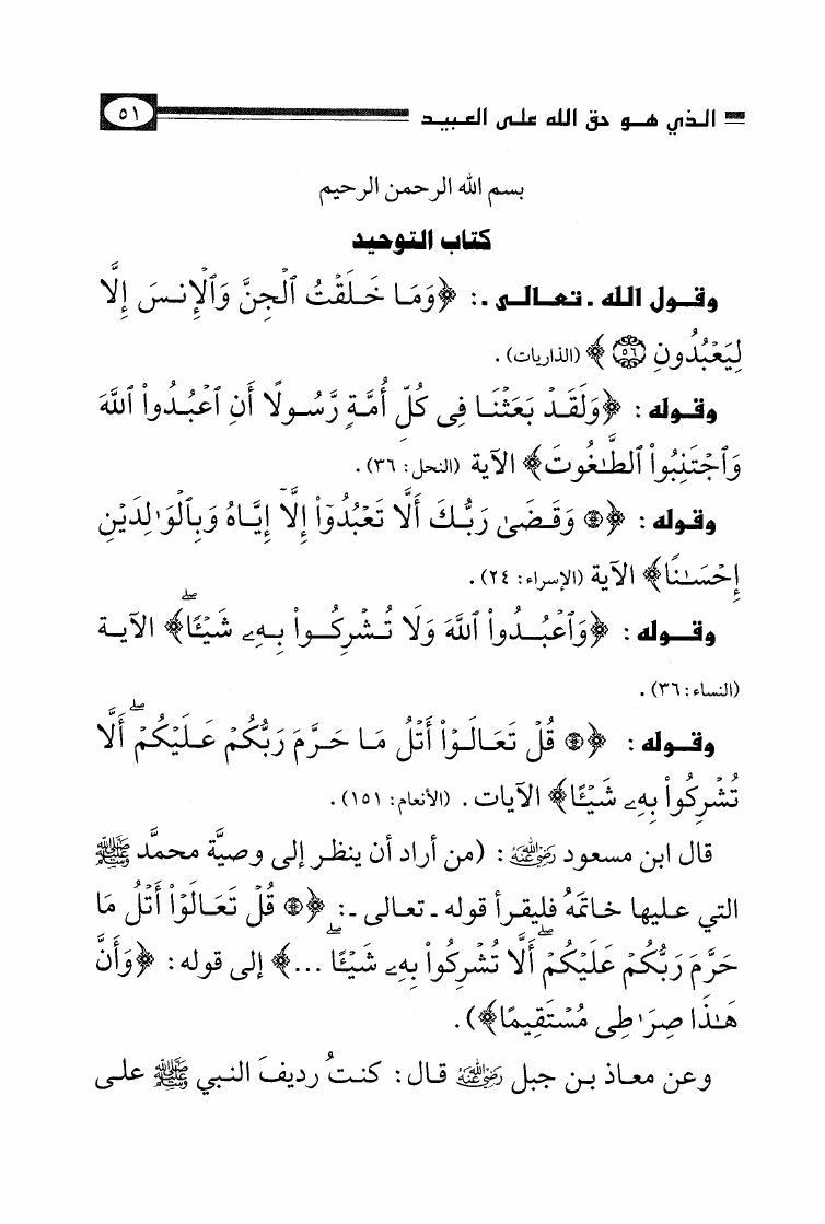 نام کتاب : الأصول الثلاثة وشروط الصلاة والقواعد الأربع وكتاب التوحيد وكشف الشبهات والواجبات المتحتمات والأربعون النووية نویسنده : محمد بن عبد الوهاب جلد : 1 صفحه : 51