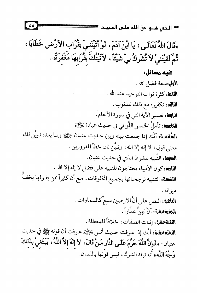 نام کتاب : الأصول الثلاثة وشروط الصلاة والقواعد الأربع وكتاب التوحيد وكشف الشبهات والواجبات المتحتمات والأربعون النووية نویسنده : محمد بن عبد الوهاب جلد : 1 صفحه : 55